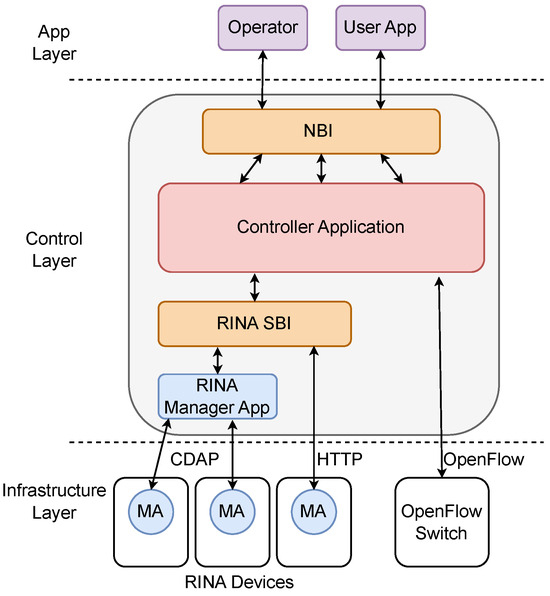 The proposed architecture follows the SDN generic architecture that is based on three layers: the application layer, control layer and infrastructure layer, to facilitate the adoption of RINA in the current SDN networks. The architecture presents three key components in the control layer and the infrastructure layer to enable the management of RINA devices (RINA-based IoT devices, RINA-based IoT gateways, RINA-based EdgeNodes, and the RINA-based core). These components are the RINA Management Agent (MA), the RINA manager application, and the RINA SBI.