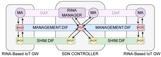 On the other hand, the RINA manager is the core of this centralized network management DAF and must be implemented in the SDN controller. The RINA manager oversees the communication with the agents in each system of its management domain to provide central configuration, fault, security, and performance management. There is the possibility of implementing more than one RINA manager and reduce the area each RINA manager covers. In other words, the IoT network can be split into several management subareas, with an SDN controller for each subarea. This approach reduces the IoT network management complexity.