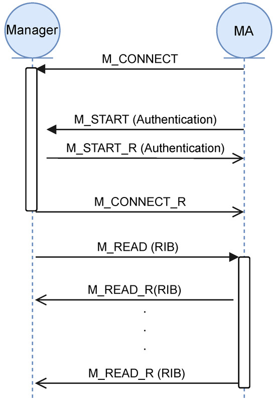 Once the single dedicatedDIF has been established, the MAs intend to communicate with the RINA manager. To do so, the MAs and the RINA manager change several CDAP messages in the first stage of shaping the DAF management. Figure 5 shows this initial process. The MAs intend to send an M_CONNECT—CDAP message—to the RINA manager. This message contains information about the source application process, destination application process, and authentication mechanism employed. The application process will change more messages depending on the authentication mechanisms selected in each case. Once the authentication mechanisms have finished, the RINA manager responds with an M_CONNECT_R. Immediately, the RINA manager sends an M_READ to request a reading of the remote RIB objects. The MAs react with as many M_READ_R messages as the MA has RIB objects. Once this initial stage is finished, the RINA manager is ready to start operations.