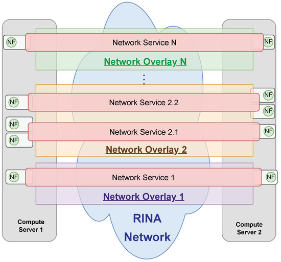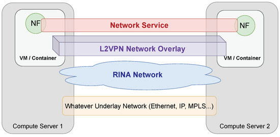 - Ponce de Leon, M.; Ranganathan, R.; Bainbridge, D.; Ramanarayanan, K.; Corston-Petrie, A.; Fundacio, E.G. Multi-operator IPC VPN slices: Applying RINA to overlay networking. In Proceedings of the 2019 22nd Conference on Innovation in Clouds, Internet and Networks and Workshops (ICIN), Paris, France, 19–21 February 2019; IEEE: Piscataway, NJ, USA, 2019. [Google Scholar] [CrossRef]