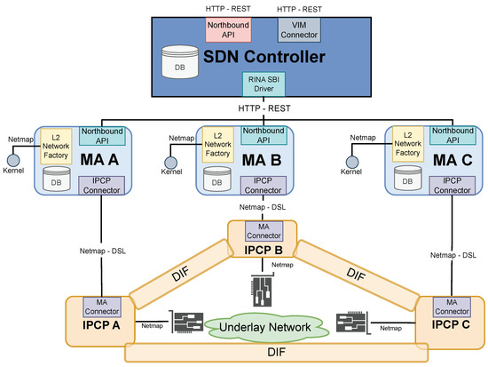 The network management DAF is composed of several application processes that enable management characteristics in RINA nodes or RINA systems. In this case, the application processes are the MAs implemented in each RINA system and the RINA manager implemented in the SDN controller. Figure 4 shows the management DAF composed of the MAs and the RINA manager.