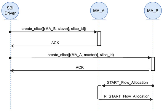 The SDN controller can control the HTTP-based MAs by using the RINA SBI. The RINA SBI is responsible for requesting the needed resources to every HTTP-based MA involved in the slice. Every slice creation or deletion request is processed with the reception of an HTTP request on the REST endpoint notify of the NBI. Figure 9 shows the message interchanged between the RINA SBI driver and the HTTP-based MAs to create the slice. In order to create an L2 network overlay between two MAs, one takes the role of master and the other takes the role of slave. The master will start the flow allocation process and the slave will be awaiting the allocation request from the other MA. By looking at Figure 9, it can be seen that the SBI driver starts the L2VPN overlay creation by sending a message to MA_A, stating that the remote MA involved is MA_B. In this L2VPN creation, MA_A will perform the role of slave, i.e., it will be awaiting MA_B’s flow allocation request. On the other hand, the SBI driver sends a message to MA_B stating that the remote MA is MA_A and its role in the overlay creation is master. Immediately, MA_B starts the L2VPN creation by sending a RINA flow allocation request to MA_A.