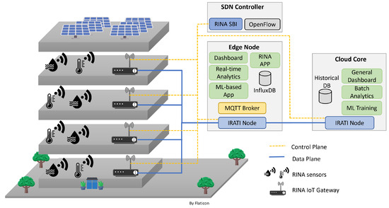 The remainder of this document is organized as follows: Section 2 reviews the current SDN and NFV technologies with a special focus on IoT environments, and presents the RINA concept and its current developments. Section 3 describes the proposed architecture to integrate SDN technologies with RINA. Section 4 presents the smart building use case implementation. Section 5 provides information on the obtained results and, lastly, Section 6 compiles the lessons learned and presents the future work.