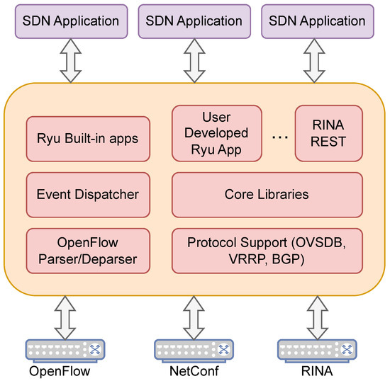 This work addresses the challenges mentioned earlier to enable the integration of SDN technologies and RINA by providing a RINA-based management Distributed Application Facility (DAF), a RINA SouthBound Interface (SBI) driver, and a RINA-Layer 2 Virtual Private Network (L2VPN). The architecture proposed in this work enables the management of RINA nodes and the management of SDN switches. The DAF management enables a DIF layer to establish management connections between the RINA nodes and the SDN controller. A RINA SBI driver is proposed to translate the SDN data models into RINA data models. The RINA SBI driver is a Ryu framework [10] component with a well-defined API to enable the development of control and management applications. Finally, the RINA L2VPN provides a transparent connection between applications that cannot use the RINA API to allocate flows. These developments have been accomplished within the context of the TERMINET [11] project.