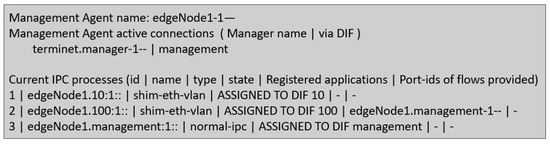 The first validation consisted of verifying the IRATI console of the edge node to check if the IPCP was enrolled into the management DAF. During enrollment, the RINA manager interchanges CDAP messages with the MA to establish the DAF management, as described in Section 3.1. Figure 13 shows the edge node console, and we can notice in the last line that the edgeNode1.management was assigned to DIF management. In this case, the edgeNode1 MA was accepted as part of the management DAF and interchanged CDAP messages with the terminet.manager-1. Furthermore, the RINA SBI registered MA as a new system and assigned a system ID. This register is relevant to keep track of the MA connected into the DAF and to return as systems information when the SDN controller requests the list_systems API.