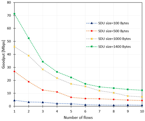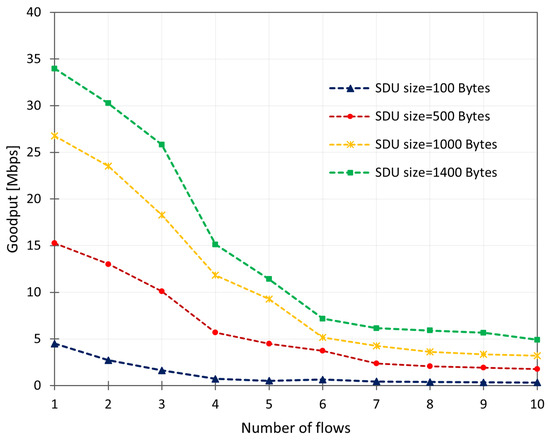 In contrast to the first test, this test allocated unreliable flows without re-transmission control, so the allocated flows are similar to a User Datagram Protocol (UDP) connection. The measurement was performed similarly to the first experiment. Figure 17 shows the goodput of unreliable flows in the function of the number of flows for different SDU sizes and the test for diverse SDU sizes. Similar to the first experiment, the curves show a degradation of goodput as far as the increasing number of flows that the RINA-based IoT gateway supports. Since the allocated flows are unreliable, the goodput achieved is lower than the theoretical throughput in a fast Ethernet network card and higher than the unreliable flows with transmission control. This variability is the expected behavior because this case does not use the transmission control mechanism that affects the goodput, as was observed in the unreliable flows with the transmission control case. The maximum goodput achieved was 72.2 Mbps with SDUs of 1400 bytes. This goodput is more than 2/3 of the theoretical throughput (100 Mbps).
