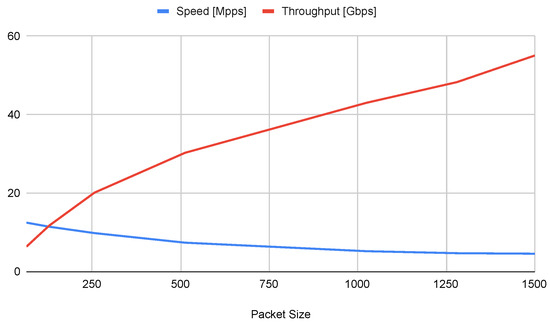 In order to evaluate the performance of RINA L2VPN, two different tests have been performed. In the initial test depicted in Figure 18, a traffic generator was employed to transmit L2 packets across a single overlay. This test scenario is illustrated in Figure 6, where the network service took on the role of the traffic generator, while the receiver and sender sides functioned as dedicated network functions (NFs). For the traffic generator, we opted for pkt-gen v11.3 [40], a traffic generator leveraging the netmap API. This choice was motivated by the netmap API’s capacity to attain higher data rates. It is important to note that all experiments were conducted within a fully virtualized environment, thus avoiding hardware limitations. Consequently, these controlled experiments serve as a benchmark.