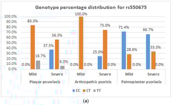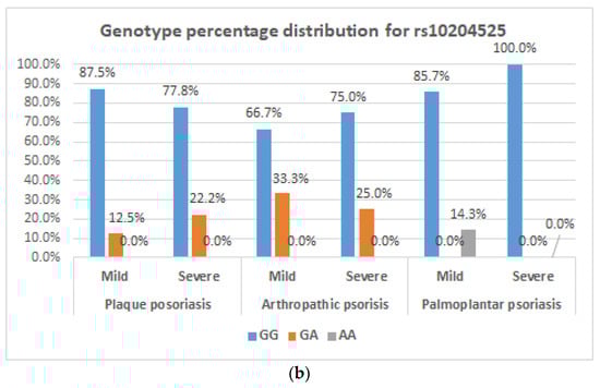 Figure 1a,b show genotype percentage distribution of the two genes studied according to disease severity for each type of psoriasis.