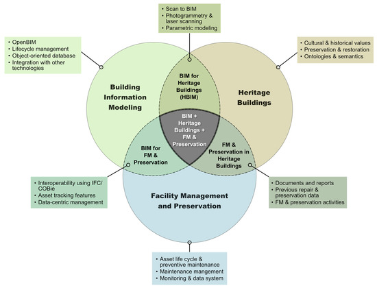 Figure 1 presents an overview of the existing and overlapping literature concerning BIM, heritage buildings, and facilities’ management as well as preservation. The circles depict research topics, and the bullet points within the rectangular boxes illustrate the research focus or overlap of each topic. Building information models utilize the OpenBIM standard to store a wide range of building properties as an information model, encompassing geometric data, non-shape attributes, project planning, and lifecycle management [12,13]. This method aligns with the fundamental concepts of object-oriented programming and modeling. In the context of heritage architecture, the HBIM concept has been used to model, document, and conserve historical structures. Several studies have investigated the implementation process and techniques of HBIM [14,15,16,17,18]. They have also examined its benefits and drawbacks in improving maintenance and operational efficiency. Furthermore, studies have investigated the incorporation of cutting-edge technologies and equipment, such as laser scanners, photogrammetry, and visual programming, into HBIM [19,20,21,22]. In the realm of the facility management of heritage buildings, there have been studies on data utilization methods to support decision making for building maintenance. These include structural [23,24] and condition analyses [25,26] of heritage buildings by integrating lifecycle data into HBIM. Methods to ensure data sharing and mutual compatibility for planning maintenance and restoration actions based on the integrated information of historic buildings for BIM have also been researched [27,28]. Furthermore, diverse web platforms were developed to promote cooperation and collaboration among the different stakeholders involved in the restoration and maintenance activities of built and cultural heritage sites, by integrating historical and geometric information and heritage documentation databases [29,30,31]. These HBIM case studies address issues related to modeling complex architecture, accurately documenting historic buildings, and creating data structures suitable for modern HBIM for an online platform. Although various technologies and applications have been explored in numerous studies, there is still a research gap in the application of BIM to preserve and manage heritage buildings. Most studies related to HBIM maintenance involve different technologies and application cases, but few focus on creating an organized BIM-based maintenance database, transferring non-shape data, or establishing maintenance procedures through attribute information, all of which are advantages of BIM. Furthermore, the discussion on the use of BIM for the preventive and repair maintenance of heritage buildings is limited. This study presents a framework for managing repair history based on BIM to address current practice gaps. To demonstrate practical implementation, the proposed framework and system modules are applied to heritage building cases.