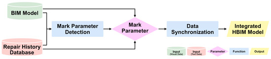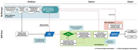 This study constructs integrated HBIM by mapping the information from the repair history DB built by the DB manager from the stages described above with the parts of BIM. The following sections provide a detailed description of the data flow and processing for system development at each stage of data collection and selection, mapping, and validation.
