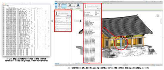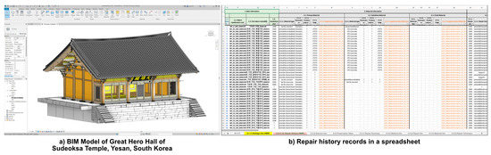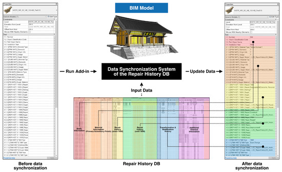 After automatically creating object classification codes and a shared parameter-based data container, the data between the repair history DB and BIM are synchronized. The integer- and string-based repair history records are input to each part of BIM. In this study, for BIM of the Great Hero Hall of Sudeoksa Temple, the developed data synchronization system for repair history records allowed for the entry of details on 1592 parts, covering 18 repair and maintenance projects since its establishment in 1308; however, some parts have no repair history and some details, such as the exact cause or type of repair, are omitted for partial repair and maintenance work. Hence, discovering relevant data in the future will require adding missing information or correcting incorrect information by updating both the repair history DB and BIM.