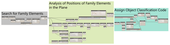 The algorithm is implemented using Dynamo, a visual scripting tool for Revit, as shown in Figure 7. Following the naming convention designated for each part family (a Revit family is a group of components used to build a BIM model with a common set of properties and a related graphical representation; for example, walls, doors, and fixtures) of the BIM model, the element type code from level 1 to 3 and the location information on the part plane are analyzed, and the index number is input. The index number consists of two digits for the floor-level information of the part, three digits for the serial number according to the location on the plane, and two digits for the classification number according to the aggregation type. The serial number is automatically assigned based on the X-, Y-, and Z-axis position information of each part and numbered per the HBIM preparation criteria, as shown in Figure 8, by assigning numbers in a counterclockwise direction based on the lowermost and outermost left of the target heritage building.
