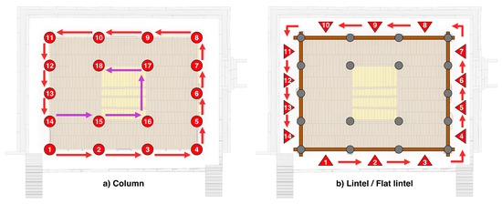Example of the serial number assignment model for the (a) column and (b) lintel and flat lintel in accordance with the HBIM standard. Modified from the Cultural Heritage Administration [32].