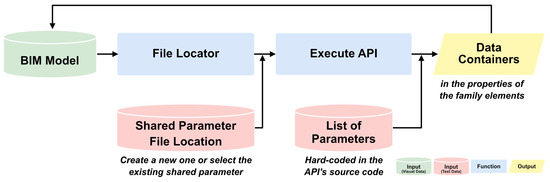 After assigning the object classification code for each part using Dynamo, a property information container is created to insert repair history records into BIM, organized in a spreadsheet format for each part. However, creating several identical parameters for all parts is a time-consuming task that can lead to spelling or ordering errors. To address this issue, the shared parameter function of Revit, which stores definitions in a text file, was used, reducing the likelihood of errors during repetitive tasks of parameter creation. To further streamline this process, an add-in was developed using the Revit API to quickly create the same parameter hierarchy for all parts using shared parameters (Figure 9).