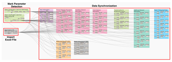 The developed input automation algorithm is executed through the Dynamo player provided by the Revit program. When the user designates the Excel file and corresponding worksheet for the repair history database, the repair history information of the record matching the object classification code in the database is inputted collectively to each part of BIM (Figure 13). The repair history records entered as attribute information of BIM can be modified inside the BIM tool, and the repair history database can be updated by re-exporting them in an Excel file format.