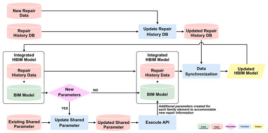 Proposed system’s pipeline for updating the repair history data of integrated HBIM with newly acquired repair information.