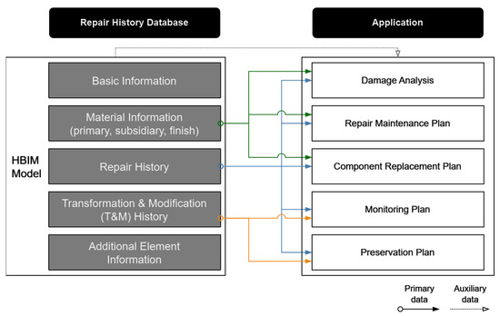 The HBIM repair history information can be used in two scenarios: developing a repair and replacement plan or developing a monitoring and preservation plan. Primary data for each application include material information, repair history, and T and M history. This information, along with basic information and additional element information, is also used as auxiliary data for each scenario to support the repair and preservation of cultural assets.