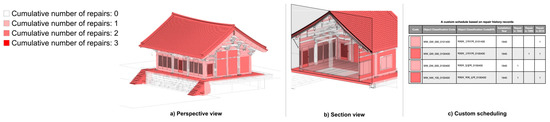 Quantitative and qualitative information can be conveyed through the use of shading colors based on their parameters. Figure 17 depicts a visual representation of the repair history records entered in the HBIM of the Great Hero Hall of Sudeoksa Temple. The data presented are based on repair history information after the 1900s, with the accumulated repair frequency data obtained through filtering the parameters corresponding to the repair year. This visualization of repair frequency data for each part of the architectural heritage, through the use of variables and data filtering functions in HBIM, can serve as basic data for the architectural heritage management entity in establishing an architectural heritage maintenance plan. Additionally, an architectural heritage repair company can utilize these data to determine the scope and repair method of heritage buildings by comparing HBIM with the on-site situation.