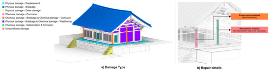 The DB manager collects repair history records for each part of HBIM during the data collection and selection stages. The collected information includes data related to repair work, such as design books, repair reports, and supervision reports. Architectural heritage comprises diverse materials, and a distinct approach must be adopted for each component based on its type, material, and current state to preserve its historical value and authenticity. Repair history data should include detailed information regarding cause and effect, phenomena, and countermeasures for each component and be structured according to standardized principles and regulations. Such data can be used as evidence in decision-making processes for restoring architectural heritage in the future. Consistent object classification and attribute information input are necessary for ensuring interoperability and compatibility with other systems.
