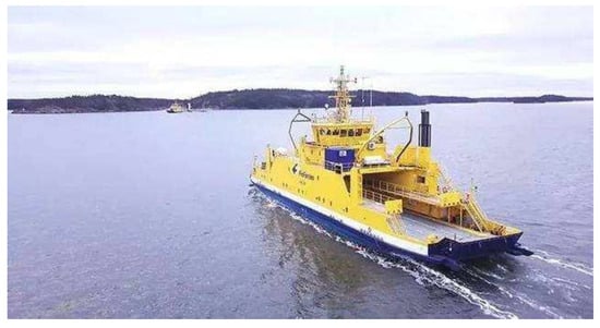 European countries are actively developing test smart ships. In December 2018, Rolls-Royce and Finferries put into operation the world’s first smart ferry, Falco, as shown in Figure 1, which operates in the archipelago in the southern part of Turku, Finland. The ship has a certain autonomous navigation capability and can autonomously avoid collisions [7]. In May 2018, the 42 m-long carbon fiber all-electric catamaran “Future of The Fjords” began sailing, and is the first vessel of its kind to offer completely emissions-free transport through the Western Norwegian landscape [8]. In February 2020, the Kongsberg Group conducted adaptive transit on the ferry Basto Fosen VI, which has functions such as enhanced intelligent perception, autonomous docking and undocking, hazard warning, and route planning, and the equipment at the ship’s ends can be fully operated automatically [9].