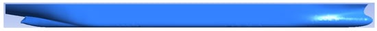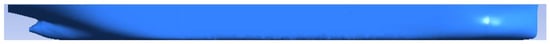 Bow type: A full-form ship with a shallow draft has a full-line shape, a large wet surface area, and a low Froude number [21]. The wave-making drag accounts for a small portion of the total drag such that the viscous drag accounts for the majority of the total [22]. Optimizing the bow line shape can effectively reduce the bow wave breaking drag and bilge-vortex drag. Bulbous, forward, watermelon, and vertical bows are the four bow types commonly used in inland ships, as shown in Figure 4, Figure 5, Figure 6 and Figure 7. Commercial software FLUENT (2021 R2) was used to predict the drag at different speeds. The corresponding total drag coefficients are shown in Table 1. The bulbous and vertical bows exhibited similar drag performances. In areas with restricted dimensions, such as ship locks, the vertical bow has significant advantages and was therefore adopted in the inland ship types we developed.