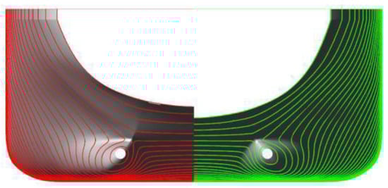 Stern type: For wide, flat, and full-form ships navigating inland waterways, their sterns contract more drastically with a high longitudinal gradient. These shapes easily lead to bilge vortices at the tail [23], resulting in increases in energy dissipation and thus increases the drag on the ship. In addition, the large block coefficient of a stern body causes uneven wake at the surface of the propeller blades [23], which affects the propulsion efficiency. For the twin-skeg ship type, the twin stern fins act as a catamaran, thereby reducing the length-to-width ratio of the ship, and slowing the degree of stern hull contraction, thus resulting in superior performance. Twin-skeg ships use the deflection of the stern fins to pre-swirl the incoming flow, which can also improve the anti-rotating propulsion effect [24] of the propeller efficiency and demonstrate excellent maneuverability. The twin stern fins combine the excellent maneuverability of the twin-skeg ship type with good resistance to slamming, making it more suitable for river-sea-going vessels in both river and sea. Adopting an external rotating twin-skeg stern shape as shown in Figure 8, a pre-swirl is formed at the propeller disc during ship navigation to improve the propulsion efficiency of the propeller.