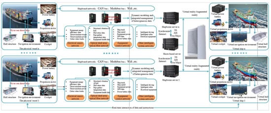 Considering the battery modules, navigation data and environment, equipment state, and hull structure state and using advanced perception, heterogeneous network construction, data and digital twin modeling, virtual/augmented reality, and software service methods, a smart-integrated platform system for inland ships was designed and developed [45]. The smart information integration system is the “heart” of the green and smart ships for inland water, as shown in Figure 10, and it is responsible for the monitoring and management of the ship’s state. Through the unified digital description and dynamic description modeling methods for heterogeneous perception data of the ship’s operating state, the dynamic unified modeling of this data was achieved. Further, an efficient data retrieval and data access sharing mechanism allows for the integrated management of heterogeneous data of the ship operating state in the shipboard server.