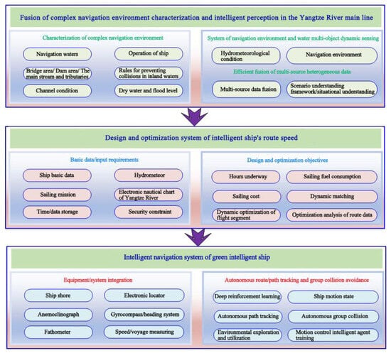 Computer and control technology is used to analyze and process the acquired information to assist the captain in designing and optimizing the ship’s route and speed. With the help of a shore-based support center, this technology informs the captain’s decision making in open waters, narrow waterways, and complex environmental conditions [48]. Channel information and smart perception of the ship attitude in the complex navigation environment of inland waterways can provide dynamic, real-time, and reliable environment and ship navigation information for decision making. We mainly performed work on characterization technology of the navigation environment of inland ships, multi-source heterogeneous data fusion technology, and situational awareness-based smart navigation eye technology. Complex inland waterways make it necessary to also smartly analyze collision avoidance rules [49]. We conducted technical research on route/speed design and optimization based on multi-objective deep reinforcement learning to provide effective decision-making information and form a smart navigation assistance decision-making system. Figure 11 shows the block diagram of the navigation decision making for inland ships in a typical situation.