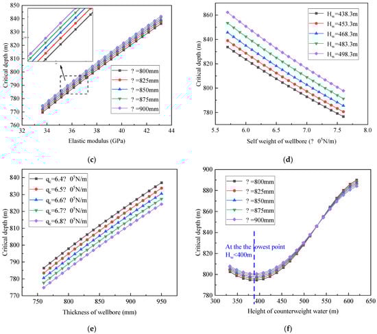 - The critical depth of the wellbore structure by using optimization measures is influenced by multiple factors. It increases with the increase in the elastic modulus and the thickness of the wellbore, decreases with the increase in the self-weight of the wellbore, and shows a trend of first decreasing and then increasing with the increase in the height of counterweight water.
