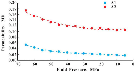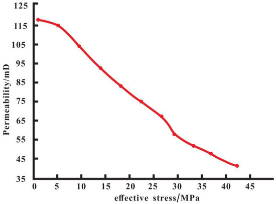 where, is the effective stress, in MPa; is the reference effective stress, in MPa; K is the permeability, in mD; is the permeability under the reference effective stress (), in mD; α is the stress sensitivity coefficient of the power law model; β is the stress sensitivity coefficient of the exponential model; and g and z are fitting coefficients.