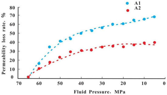 The value of K0 is the original permeability of the formation, and Kh is the permeability measured under different fluid pressures that correspond to different effective stresses. Based on the data obtained in the high-temperature and high-pressure testing conditions (Table 2 and Table 3), the permeability–effective stress relationship curve (Figure 2) and permeability loss rate (Kh/K0)–effective stress relationship curve (Figure 3) were drawn.