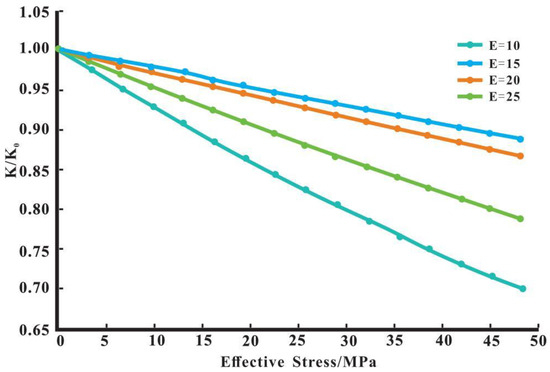 Fractured carbonate reservoirs with a low Young’s modulus possess higher elastic deformation capability, and fractures tend to close relatively easily without significant deformation. Thus, for fractured carbonate reservoirs under these circumstances, their stress sensitivity may be low. However, in fractured carbonate reservoirs with a high Young’s modulus, the rock stiffness is greater, and external stress changes tend to cause the widening of the already existing fracture(s). At this point, the stress sensitivity of fractured carbonate reservoirs may generate high sensitivity, expressing that the rock is highly sensitive to variations in stress. It should be noted that the stress sensitivity of fractured carbonate reservoirs is also influenced by other factors, such as the number, size, and distribution of fractures. In addition, the actual rock properties and technical conditions can also impact stress sensitivity. If the Young’s modulus E of these rocks is changed to 10~30 GPa, the stress sensitivity curve would exhibit characteristics as shown in Figure 5.