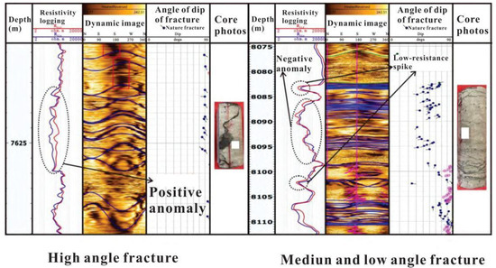 The development of natural fractures in the study area was investigated through resistivity logging. Resistivity logging is relatively sensitive to fracture identification and can be affected by factors, such as fracture orientation, extension length, and mud invasion depth. In lateral logging, because the measuring circuit is in parallel with the low-resistance fracture, the resistivity is greatly affected in the vertical fracture segment and can be identified by the lateral logging for vertical fractures. In the induction logging, the measuring circuit is in parallel with the horizontal fracture, and the resistivity is greatly affected in the horizontal fracture segment such that it can identify vertical fractures.