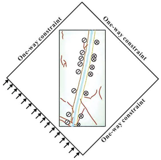 According to previous research, when high-angle fractures develop, lateral resistivity displays a positive anomaly while middle and low-angle fractures display a negative anomaly or a low-resistivity peak (Figure 6). At present, the overall tectonic stress field in the southern section of the fault zone is oriented in a northeast–north direction, and there is an obvious deviation in the local stress field, with the direction of the Earth’s stress being near east–west and north–northeast (Figure 7). Therefore, in this study, DFN discrete modeling and dual media numerical simulation were used to simulate the impact of stress sensitivity in the stratigraphic layer. In the numerical simulation process, the dual media model divided the matrix and fractures into two systems, and the reservoir permeation occurred in the fractures. Different formulas for stress sensitivity were assigned to the matrix and fractures, respectively, to calculate the change in permeability under the influence of stress sensitivity.