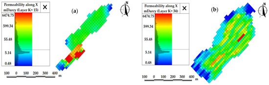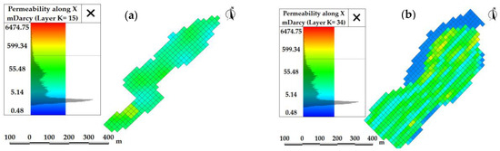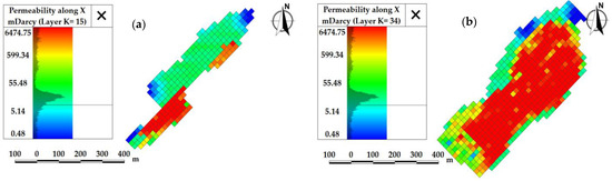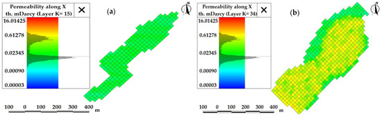 Initial permeability of matrix-type carbonate reservoirs. Layer (a) = 15; (b) = 34.