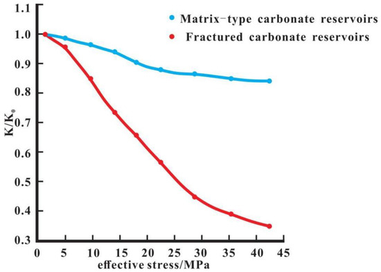 Comparison of stress sensitivity curves for matrix-type and fractured carbonates.