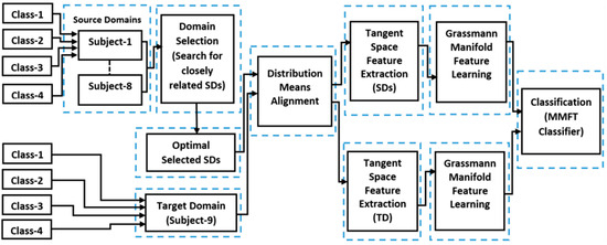 - She, Q.; Cai, Y.; Du, S.; Chen, Y. Multi-source manifold feature transfer learning with domain selection for brain-computer interfaces. Neurocomputing 2022, 514, 313–327. [Google Scholar] [CrossRef]