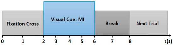 The BCI competition IV-a database consisting of four-class MI datasets acquired from nine subjects was considered for experimentation. In this case, the four-class MI (left, right, both feet, and tongue) data represented EEG signals recorded from the brain using twenty-two Ag/AgCI electrodes [24,25]. All the EEG channels were placed on the surface of the scalp according to a 10–20 electrodes positioning system. Subsequently, the beginning of the experiment was depicted as t = 0 s, and a fixation cross “+” was displayed, while the participants were requested to seat and focus their attention on a computer monitor. Visual cues in the form of arrows pointing to four different directions were displayed on the monitor for t = 1.25 s [26]. The experiment’s participants were required to perform four MI classes from t = 3.25 s to t = 6 s, as illustrated in Figure 2.