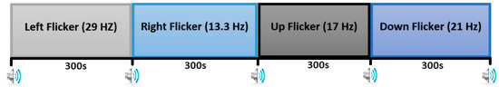 Furthermore, an SSMVEP dataset was recorded in a confined lab using nine healthy experiment participants (eight male subjects and one female subject, between the ages of 25 and 35); all the experiment’s subjects were recruited and randomly selected to facilitate the investigation. A Simulink model was interfaced with a gtec EEG recording system via MATLAB to enable the acquisition of our own recorded SSMVEP dataset. In this case, the EEG recording system consisted of a gNautilus headset and a gNautilus base station that established wireless communication between the two components. The gNautilus headset consisted of 16 electrodes and a transmission module that made it possible to transmit raw EEG signals to the Simulink model, which were then saved to the MATLAB workspace for further processing. All sixteen electrodes were dedicated only to EEG signal acquisition and positioned on the surface of the scalp according to a 10–20 positioning system. Therefore, the EEG signals were recorded at a sampling rate of 250 Hz. At the beginning of the experiment, the subjects were seated facing a projecting monitor, at which point visual cues were displayed on said computer monitor. Four objects corresponding to four SSMVEP classes were sequentially displayed on the monitor [27]. The objects were flickering at different frequencies (29 Hz, 13.3 Hz, 17 Hz, and 21 Hz) and also moving in four different directions (left, right, up, and down), equivalent to the four SSMVEP classes [4,12]. Moreover, whenever an object was projected on the monitor, a beeping sound was used to notify the participants to focus their attention on the flickering object. Each SSMVEP class was recorded for 300 s, resulting in 7500 samples, as illustrated in Figure 3.
