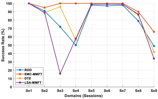 Moreover, removing a single less-beneficial domain in each iteration is demonstrated to pose severe implications for the classification performance, with a significant decline in CA being observed across S8 when DTE, ROD, and LSA-MMFT are employed. The highest CA of 53% is observed when ROD is employed, compared to both DTE and LSA-MMFT, while a 44% increase in CA is observed, with a superior CA of 97% being recorded across S8, when EMC-MMFT is employed, as depicted in Figure 8.