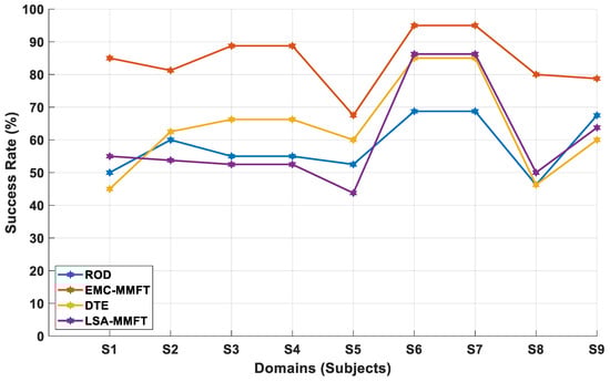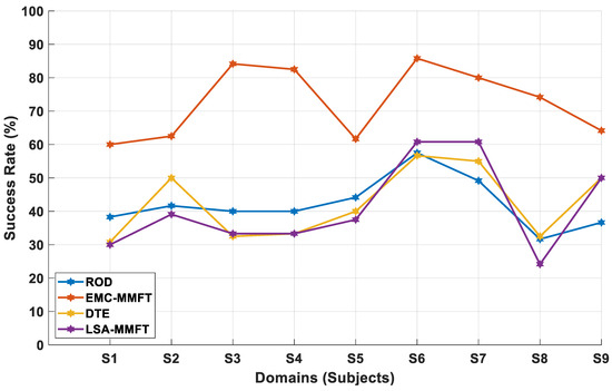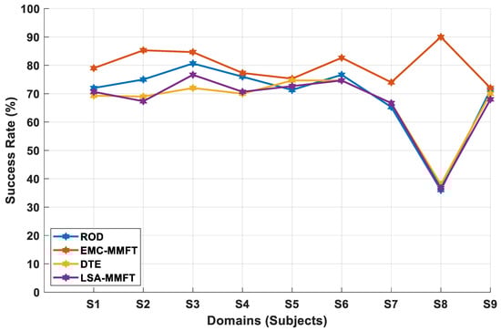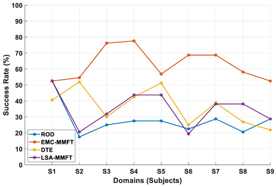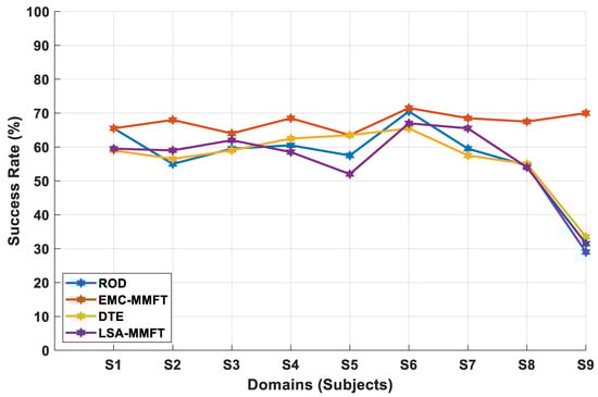 The impact of less- and highly beneficial domains on transfer mapping performance is further investigated using nine of our own MI subjects. As such, the EMC-MMFT framework is further compared with the DTE, ROD, and LSA-MMFT algorithms under a two-class inter-subject classification scenario. Consequently, the highest CA of 85% is observed across S2 when DTE is employed, while the highest CAs of 82.5% and 78.75% are recorded across S2 when LSA-MMFT and ROD are applied, respectively. In this case, superior prediction rates are observed across all the individual TDs when EMC-MMFT is employed, whereby the highest CA of 92.5% is recorded across S9 when S3, S4, S5, S6, and S8 are selected as the optimal combination of highly beneficial SDs using EMC-MMFT, as illustrated in Figure 7. Notably, a significant increase of 35% in CA is observed across S9 when EMC-MMFT is compared with DTE, whereby a CA of 57.5% is recorded when DTE is employed, while EMC-MMFT demonstrates its superiority, with a CA of 92.5% being recorded. Moreover, utilizing only the best selected highly beneficial SDs is proven to effectively increase the CA in the TD, with a 32.5% increase in CA observed across S4 when EMC-MMFT is compared with both DTE and LSA-MMFT. In this case, a CA of 73.75% is recorded when EMC-MMFT is employed, while a CA of 41.25% is recorded when DTE and LSA-MMFT are applied, respectively. The results further illustrate that removing a single less-beneficial domain in each iteration can significantly deteriorate the classification performance, as a result of each subject responding differently to another different subject. However, selecting only the best combination of closely related highly beneficial sources can significantly minimize the effect of NT and, in turn, increase performance in the TD.