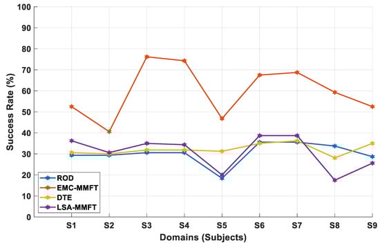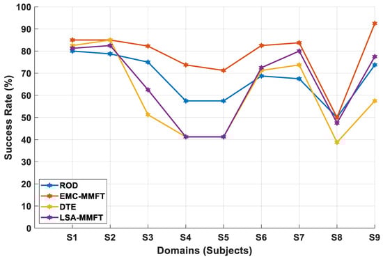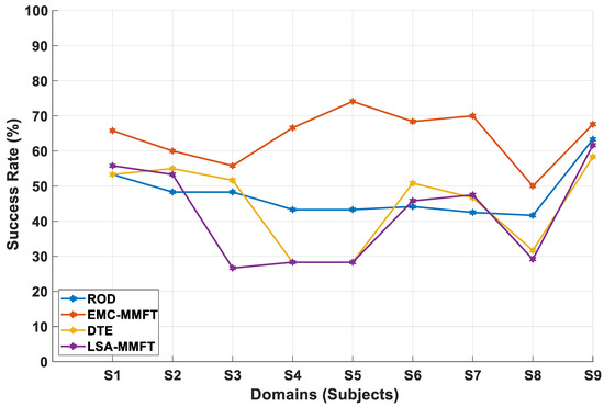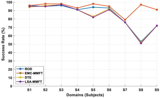 When DTE is employed, the transferability between the SD and the TD is evaluated by linking the distribution information with the between-class scatter matrix in the SD and the between-domain scatter matrix between the SD and the TD [10]. As such, DTE iterates through the nine domains, and each of the nine domains takes a turn being the TD. In this instance, a single less-beneficial domain is discarded in each iteration when the transferability between the SD and the TD is evaluated, while the remaining domains are assigned the roles of SDs, utilized to enhance the prediction rate in the TD. The same processing techniques applied when DTE and LSA-MMFT are employed to perform transfer mapping after source selection in each iteration are utilized when ROD is applied. In this case, the process of identifying and discarding a single less-beneficial domain is repeated in each iteration until two domains remain; then, the best performance across each iteration is considered. Notably, whenever a new domain is assigned the role of TD, the above-mentioned process is repeated.