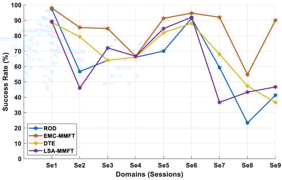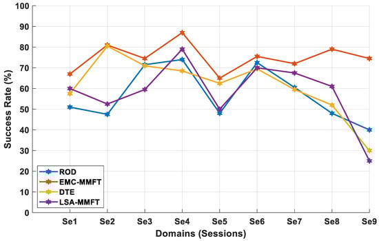 Figure 5 presents the classification performance of the EMC-MMFT framework when compared with the three domain selection algorithms (DTE, ROD, and LSA-MMFT) under a two-class inter-session classification scenario. Performance evaluation in this instance is carried out to determine the effect of both less- and highly beneficial domains (which significantly contribute to NT) on the transfer learning prediction rate across individual target domains. From the evaluation, one finds that iterating through the domains and removing a single less-beneficial domain in each iteration proves to pose severe implications for performance across individual TDs, denoted by a low prediction rate across the TDs [34]. Consequently, all four domain selection algorithms yield remarkable classification performances for a less complex classification problem—in this case, a two-class problem. As such, the highest CA of 100% is observed when Se1 is selected to be the TD and a single less-beneficial SD is removed when LSA-MMFT is employed, while the highest CA of 100% is recorded when Se1 is assigned the role of TD and four less-beneficial SDs are removed when DTE is employed. Moreover, the highest CA of 100% is also observed when Se1 is selected to be the TD and three less-beneficial SDs are removed when ROD is employed, as depicted in Figure 5. Notably, a significant decline in CAs is recorded across Se4 and Se9 when DTE, ROD, and LSA-MMFT are employed, with a significant decline of 16% in the CA recorded across Se3 when LSA-MMFT is employed. However, the EMC-MMFT framework maintains superior CAs across all individual TDs, with the highest CA of 100% recorded across Se1, Se3, Se4, Se5, Se6, and Se7. Notably, an inferior CA of 66% is recorded across Se9, and Se1, Se3, and Se9 are assigned the roles of SDs when EMC-MMFT is employed, as depicted in Table 1. In this case, when EMC-MMFT is compared with ROD, DTE, and LSA-MMFT across Se9, EMC-MFFT still maintains a superior CA.