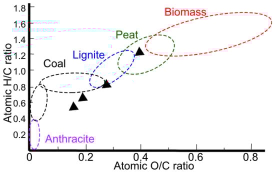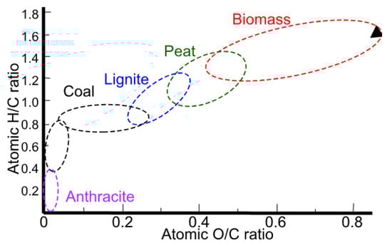 The ultimate analysis of the pea pod waste is presented in Table 5. With these results, the O/C, H/C, and C:N ratios are obtained. The O/C, H/C, and C:N ratios are important parameters in the characterization of organic compounds, including biomass and coal. The H/C ratio is a measure of the degree of saturation of a compound, with higher values indicating greater saturation. The O/C ratio reflects the oxygen content relative to carbon, and the N/C ratio indicates the nitrogen content relative to carbon. These ratios are commonly used in the van Krevelen diagram (Figure 2), which is a graphical representation of the O/C versus H/C ratios of organic compounds [32]. This diagram is useful for classifying and comparing the composition of organic matter, including biomass and coal, and for understanding their origin and evolution. For example, in the case of coal, the H/C ratio shows a sharp decline in bituminous coals and anthracites, reflecting increased aromatization of the lignin structure during coalification. In the context of biomass, the O/C ratio is of great importance, as a high O/C ratio results in a low bulk energy density, highlighting the need to lower the oxygen content for efficient energy conversion [33]. Therefore, these ratios are crucial for understanding the properties and behavior of organic compounds and for optimizing their utilization in various applications.
