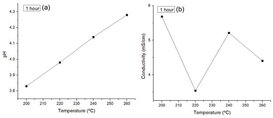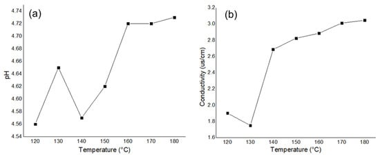 Preliminarily, the acid and sugar production in the liquid phase was monitored with pH and conductivity measurements in reactions performed for 1 h at different temperatures in the LHW range. Figure 3 shows the results obtained. Higher temperatures resulted in greater pH values, which, in addition to higher conductivity measurements, were correlated to acid production but without a major change in its production.