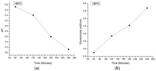 Then, the reaction time was varied at a temperature of 180 °C to see if it was a crucial factor to consider. The results are shown in Figure 4. The conductivity measurements, which revealed more ions in the liquid phase at longer reaction periods, were consistent with the pH measurements, which showed that higher reaction times produced more acids than lower reaction times. Conversely, a reaction time of 1 h produced the maximum amount of sugars, as they are species that do not contribute to lowering the pH or the amount of ions in the solution.