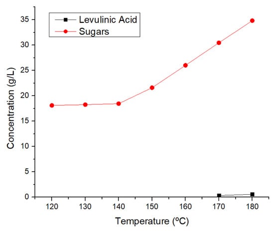 The liquid phase analysis and quantification of the corresponding components were carried out with an HPLC-RI. As shown in Table 7 and Figure 5, the sugar yield varied between 36.9% and 70.0%w when reactions of 1 h at 120 °C and 180 °C were performed, respectively, showing that the more energy provided via heat to the system, the higher the hydrolysis of the lignocellulosic structures. Moreover, levulinic acid production was achieved only at the higher reaction temperatures, 170 °C and 180 °C. There was not enough energy in the system to achieve the transformation of sugars into other molecules, which, as will be seen later, can be achieved by longer reaction times, higher temperatures, or the use of catalysts.