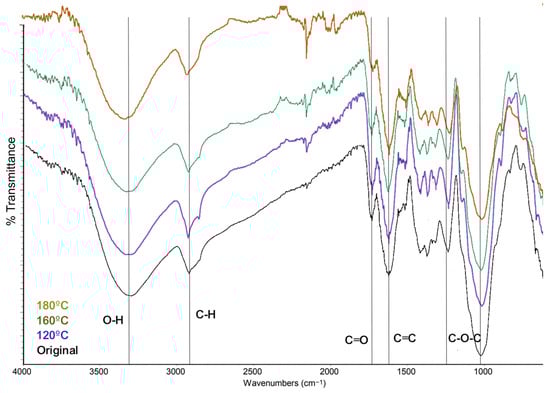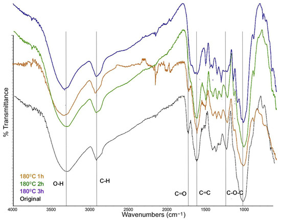 Moreover, the solid phase of the reaction at 180 °C at different reaction times was analyzed, and the results are shown in Figure 8. It shows that longer reaction times can decrease the transmittance of the band associated with cellulose, hemicellulose, and lignin (1000–1500 cm−1), confirming that at higher reaction times, those structures are broken in order to form sugars.