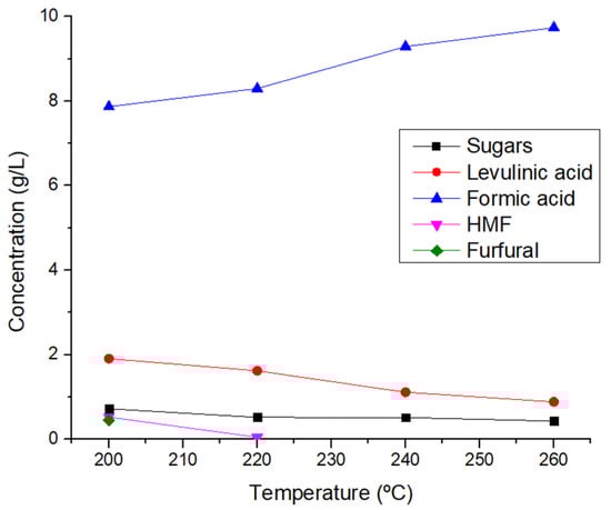Figure 10 shows the preliminary follow-up of the potential presence of acids or charged species, as explained previously for LHW. The pH shows a minimum at 200 °C, suggesting that the maximum yield of a specific acid is obtained under those conditions; this was later confirmed by the HPLC-RI quantification, where at 200 °C a maximum of levulinic acid and a high concentration of formic acid are observed. Similarly, Figure 10b shows that the conductivity of the system has a maximum of 200 °C, and after that, it starts to decrease. This can be attributed to the lower yield of levulinic acid concentrations at higher concentrations due to the degradation of smaller molecules.