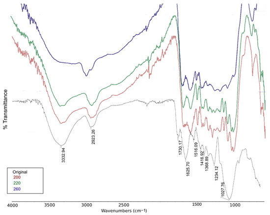 Figure 12, the IR spectra of HTC solid fractions, shows a bigger change compared to the previously presented Figure 8 and Figure 9. In this case, the band of O-H vibrations of H-bonded hydroxyl groups at around 3332 disappears due to the elimination of said functional groups from the liquid fraction. Similarly, the signals in 1027 cm−1 (symmetrical C-O-C, C-OH, and C-O vibrations of cellulose, hemicellulose, and lignin), 1516 cm−1 (C=C vibrations, indicative of lignin and aromatic C), 1625 cm−1 (C=C vibrations of aromatic compounds), and 1730 cm−1 (C=O vibrations of ketone, aldehyde, and acid groups) disappear with higher temperatures. This is due to the hydrolysis of the lignocellulosic structures and the formation of PC and the initial acquisition of biochar-like solids.